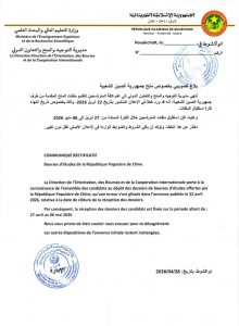 أصدرت مديرية التوجيه والمنح والتعاون الدولي التابعة لوزارة التعليم العالي والبحث العلمي في موريتانيا، بلاغاً تصويبياً أعلنت فيه عن تصحيح خطأ وقع في إعلان سابق يتعلق بمنح الدراسة المقدَّمة من جمهورية الصين الشعبية
